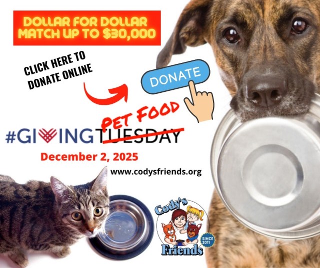 Cody’s Friends runs entirely on community support. That means every dollar and every bag of pet food you give goes directly to keeping pets healthy, loved, and with the families who cherish them.